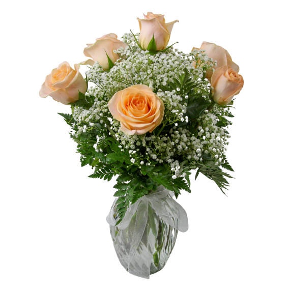 Show your appreciation with the gift of half a dozen long stem peach roses. Arranged with baby's breath and greenery, this petite bouquet arrives in a clear glass vase with a hand-tied ribbon.