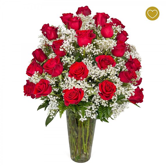 A stunning arrangement of three dozen long stem Red Roses. Highlighted by sweet baby's breath and simple greenery this bouquet is a classic beauty.