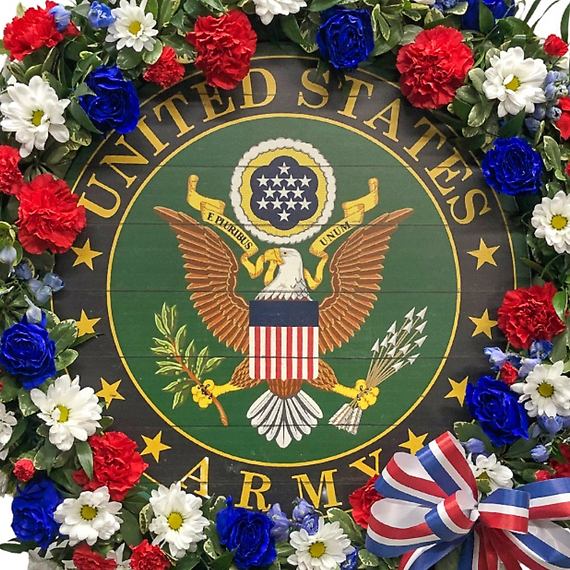 Daisies, carnations, and greenery are encircling this true Army emblem making for a striking tribute for your veteran.