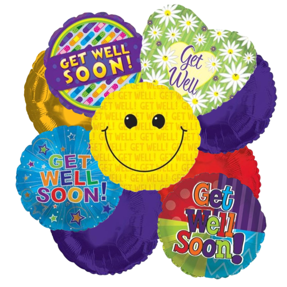 Encourage a speedy recovery with this cheerful set of 'Get Well' balloons. Includes nine mylar balloons, featuring five 'Get Well' balloons and four balloons in coordinating solid colors. Styles and colors may vary.