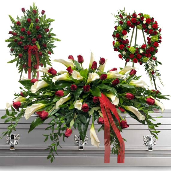 Dottie "B" Florist Red Mixed 3 Piece Set of sympathy arrangements is a stunning array of red roses, hydrangeas, boasting bells of Ireland, and elegant sprays of beautiful dendrobium orchids. Offering a powerful statement of love and respect at the memorial, funeral, or graveside service.