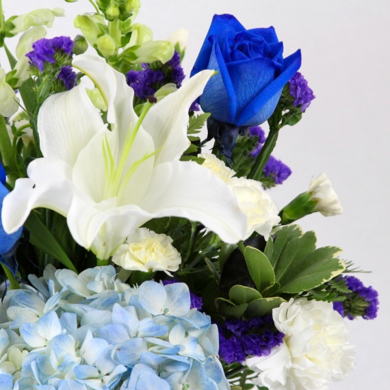 Thoughtful Elegance is a beautiful blue and white arrangement with lush hydrangea, fragrant lilies, gorgeous roses, vibrant statice, delphinium, mini carnations, and leather leaf fern in a blue container. The perfect arrangement for those blue lovers!